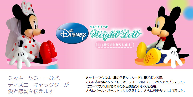 出産のお祝いに・・・ ディズニーウェイトドールシリーズ! 出生体重と同じおもさで作るぬいぐるみは 世界でたった一つのアニバーサリーギフト。 送り側も貰う側も大満足の逸品です。 <ご注文の流れ> ・ご注文後、販売店より完成品製作に必要 な「お仕立券(ご注文用紙)」をお送り致します。 ・必要事項(なまえ、体重、送り先など)記載の上 専用封筒にご注文用紙を同梱し記録の残る(簡易書留、メール便等)で販売店へご返送下さい。 ※この際の送料はお客様負担となります。予めご了承ください。 ・販売店にてご注文用紙確認後、約3週間程度でご指定先に完成品をお送り致します。 ※完全オーダーメード商品の為、ご注文後のキャンセルは不可ですので予めご了承下さいませ。 (キャンセルの場合は全額お客様ご負担となります) ■ 商品スペック