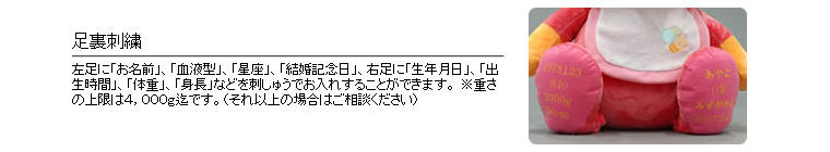 出産のお祝いに・・・ ディズニーウェイトドールシリーズ! 出生体重と同じおもさで作るぬいぐるみは 世界でたった一つのアニバーサリーギフト。 送り側も貰う側も大満足の逸品です。 <ご注文の流れ> ・ご注文後、販売店より完成品製作に必要 な「お仕立券(ご注文用紙)」をお送り致します。 ・必要事項(なまえ、体重、送り先など)記載の上 専用封筒にご注文用紙を同梱し記録の残る(簡易書留、メール便等)で販売店へご返送下さい。 ※この際の送料はお客様負担となります。予めご了承ください。 ・販売店にてご注文用紙確認後、約3週間程度でご指定先に完成品をお送り致します。 ※完全オーダーメード商品の為、ご注文後のキャンセルは不可ですので予めご了承下さいませ。 (キャンセルの場合は全額お客様ご負担となります) ■ 商品スペック